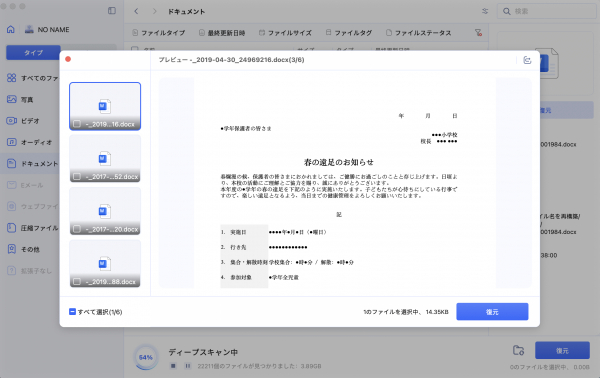 ステップ2.しばらく待つと、指定した場所にあるすべてのファイルが表示されます。復元前にプレビュー機能を提供します。Word、Excel、PowerPointなど、さまざまなファイルをプレビューできます。