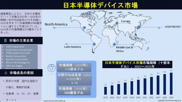 調査報告によると、日本の半導体デバイス市場は2025年~2035年の期間に年平均成長率4.7%を記録し、2035年末までに市場規模は988億米ドルに達すると予測されている。2024年の市場規模は579億米ドルであった。
