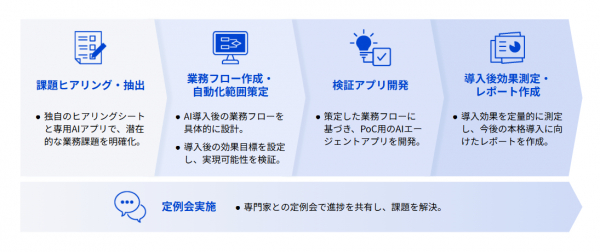 独自のヒアリングシートや専用AIアプリを用いて潜在的な業務課題を明確化し 、AI導入後の業務フロー設計から効果目標の設定までを支援します。 PoC用のAIエージェントアプリ開発 、導入後の定量的効果測定とレポート作成まで 、専門家が定例会を通じて進捗を共有し、課題解決に向けて徹底的にサポートします。