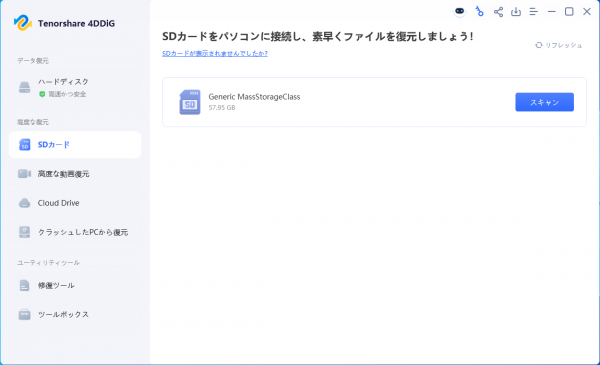 ステップ1.Tenorshare 4DDiG Free を起動し、復元したいSDカードをパソコンに接続して選択し、スキャンします。