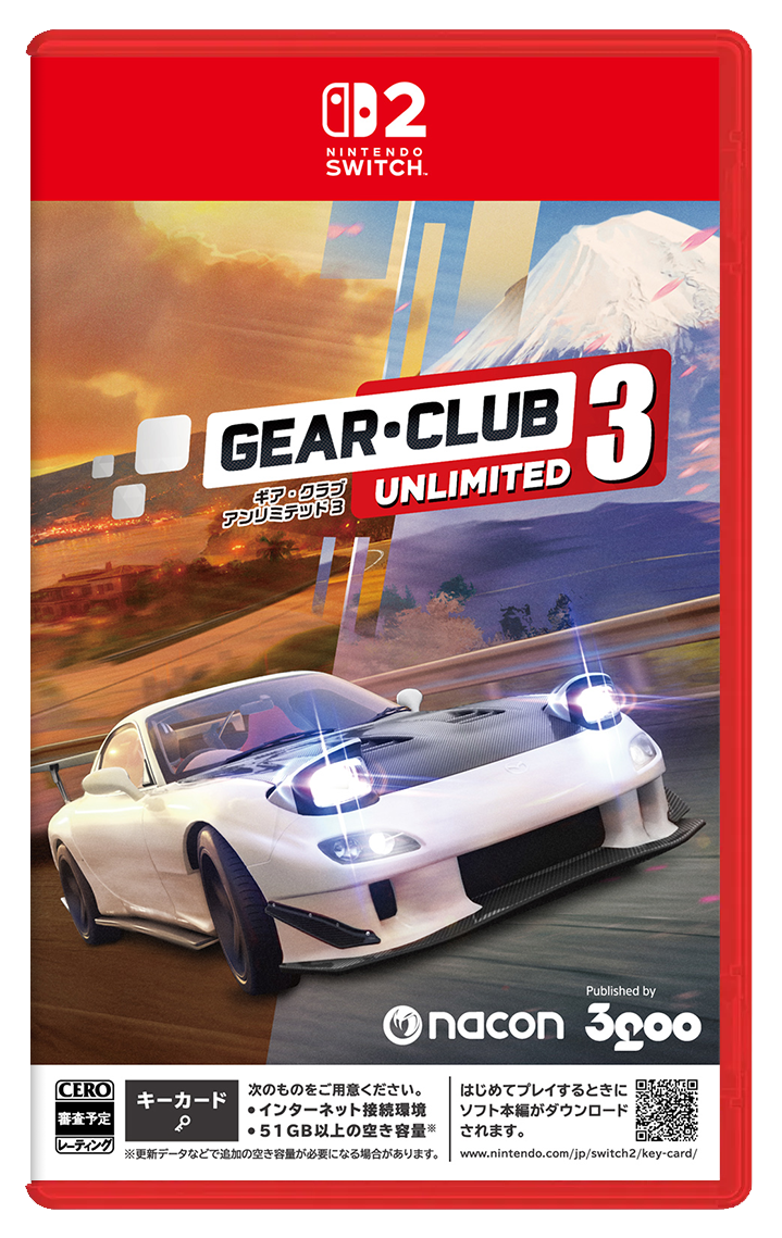 コピーライト:(C)2025 published by Nacon S.A. and developed by Eden Games. All right reserved. “Gear Club” is a registered trademark of Eden Games. All rights reserved. The manufacturers, cars, names, brand and associated imagery featured in the game are trademarks and/or copyrighted material of their respective owners. Published and distributed by 3goo K.K. in Japan.