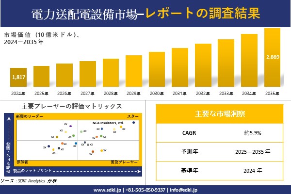 SDKI Analytics(本社:東京都渋谷区)は、このたび、2025年09月19に「電力送配電設備市場調査レポート:2025-2035年の市場規模、シェア、傾向の予測」を発表しました。電力送配電設備に関する市場調査レポートには、統計的および分析的アプローチを使用した予測評価が含まれています。この調査レポートでは、一次および二次調査方法を使用して分析された主要な業界洞察を通じて将来の傾向を理解できるようにすることで、主要な市場動向を読者に説明しています。