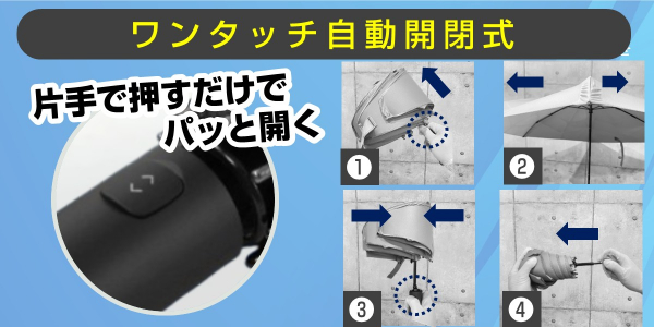 ◎ワンタッチ自動開閉ボタン :片手で押すだけでパッと傘が開閉。シャフトを手の収納すれば、傘袋にも入れやすい。