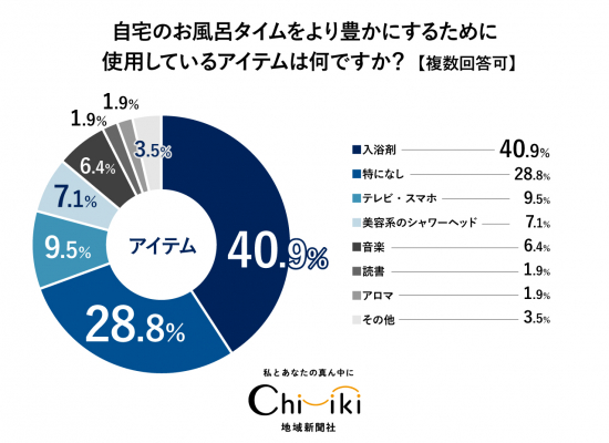 「お風呂タイムをより豊かにするために使用しているアイテムは何ですか?」という質問では、最も多かった回答が「入浴剤」で40.9%でした。2位は意外にも「特になし」。次いで「テレビ・スマホ」「美容系のシャワーヘッド」「音楽」「読書」「アロマ」と続きます。入浴剤や音楽、アロマなど、嗅覚や聴覚を楽しませるもの、またテレビやスマホ、読書など視覚で楽しむもの、シャワーヘッドのように美容効果を求めるものに大別できます。お風呂タイムで何を重視するかが、アイテム選びにも大きく影響するといえるでしょう。