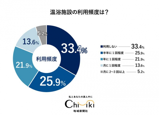 「温浴施設の利用頻度は?」という質問に対して最も多かった回答は「利用しない」で33.4%でした。2位は「半年に1回程度」で25.9%、3位は「年に1回程度」で21.9%。「月に1回程度」の人も13.5%いますが、「月に2~3回以上」の利用者は、実は5.2%と少数派ということがわかります。