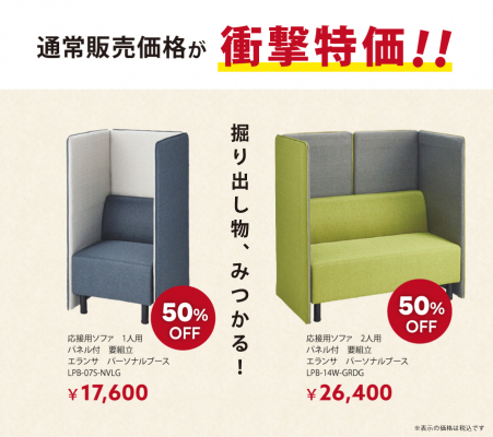 例えば周囲の視線や声を適度に遮断して集中&リラックスでき、手軽に集中スペースが作れるLION社製のエランサ・パネル付パーソナルブース 一人用ソファーが通常価格よりさらに50%オフの17,600円(税込)にて、二人用ソファーも同様に50%オフの26,400円(税込)にてご購入いただけます。(柔らかい雰囲気を与えるクロス張りです。)