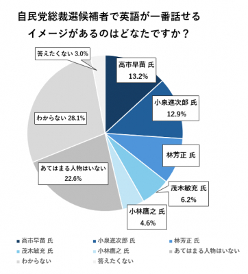 回答者1008名に対し、自民党総裁選候補者5名の中で「最も英語を話せるイメージがある人物」を尋ねたところ、高市早苗氏が133名(13.2%)で最多となり、小泉進次郎氏が130名(12.9%)で僅差の2位となった。一方で、回答者の過半数は「わからない(28.1%)」または「あてはまる人物はいない(22.6%)」と答えている。なお、9月27日に行われた自民党総裁選のネット討論会では、「日本をどういう国にしたいか」を英語で説明を求められた際、林芳正氏と茂木敏充氏は英語で回答。高市早苗氏は「ジャパン・イズ・バック!」と英語で意気込み、小泉進次郎氏と小林鷹之氏は日本語で回答をしている。