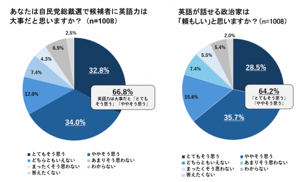 回答者1008名に対し、自民党総裁選で候補者に英語力が大事かどうか聞いたところ、「とてもそう思う」と回答した方が331名(32.8%)、「ややそう思う」は343名(34.0%)と674名の約7割は候補者に英語力は大事だと回答しました。また、英語が話せる政治家は「頼もしい」と思うかという質問では、「とてもそう思う」が287名(28.5%)、「ややそう思う」が360名(35.7%)と647名と6割以上が回答。いずれも半数以上は英語力があることにポジティブであることがわかりました。