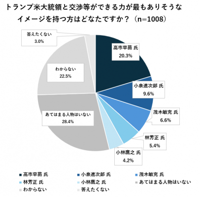 この結果から、高市氏は「英語力に加えて交渉力でも期待されている」イメージを持たれていることがわかった。一方で、「わからない」(22.5%)や「あてはまる人物はいない」(28.4%)と答えた人も多く、候補者全体として交渉力に強いイメージを持たれていない現状も浮き彫りとなった。