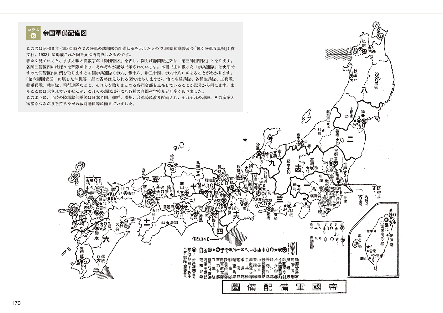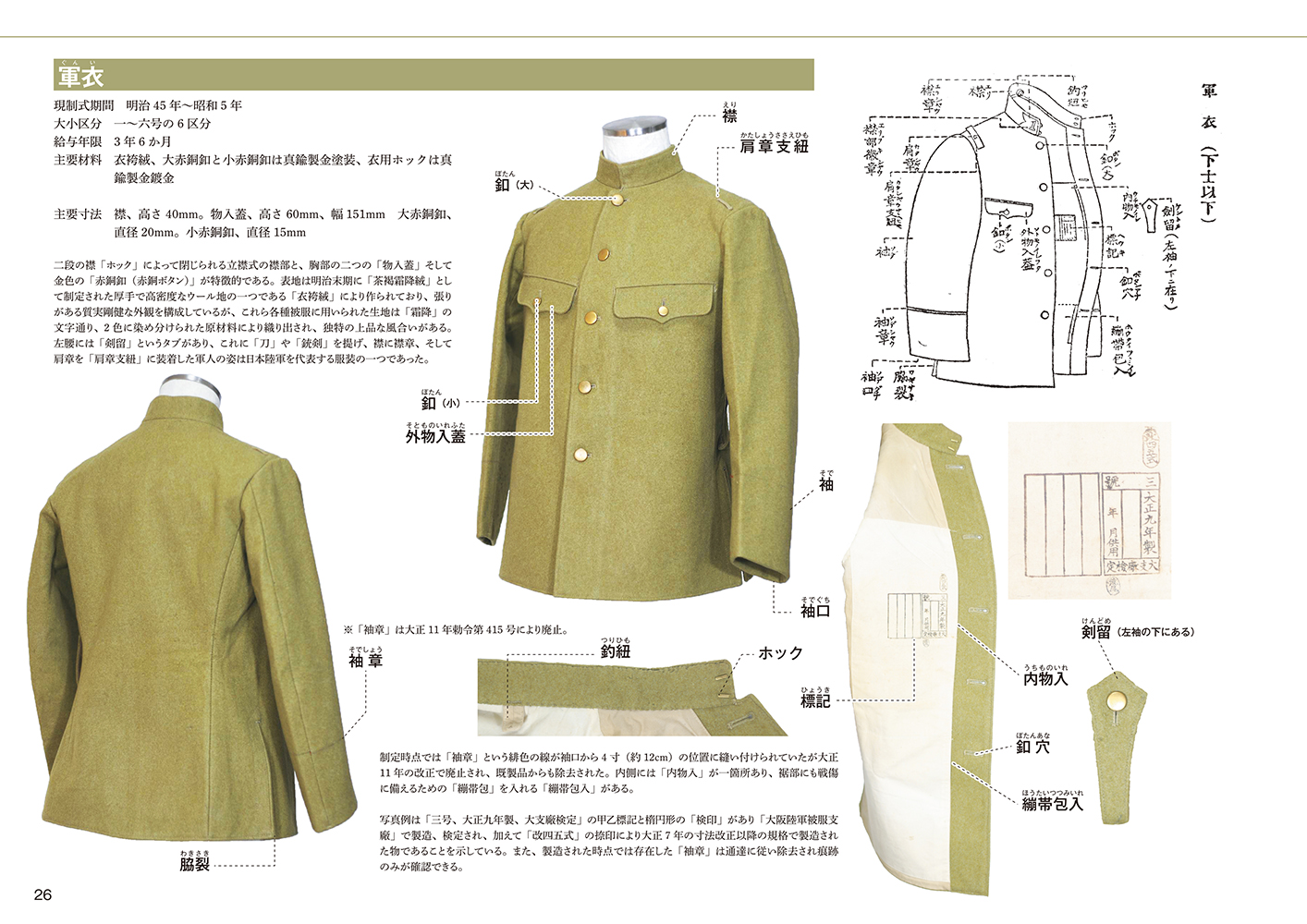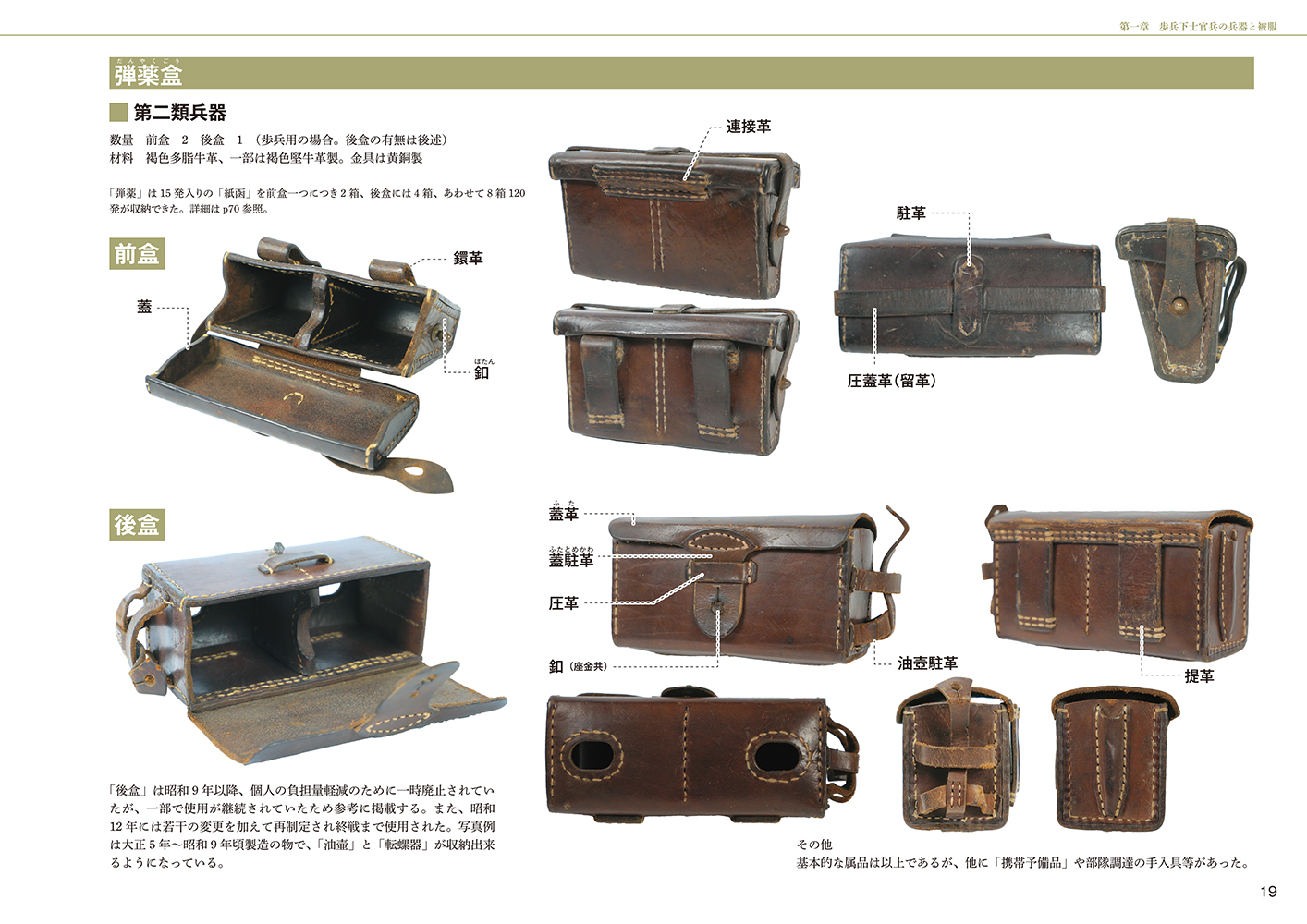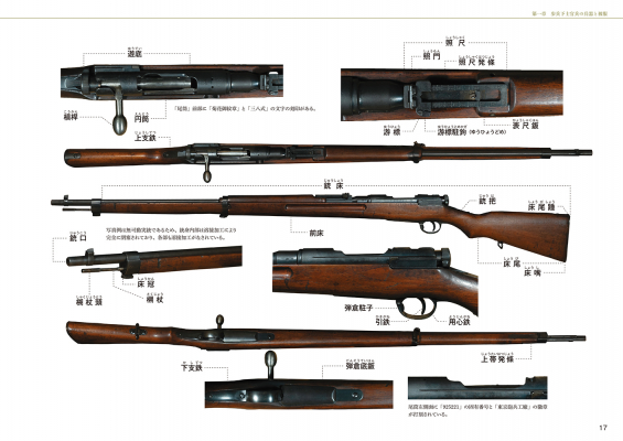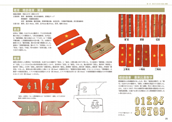 三十年式銃剣や三八式歩兵銃などの武器から、襟章・襟部徽章・肩章や携帯天幕などの装備品、またそれらの装着法や教練が、圧倒的な数の写真資料とともに説明されています。