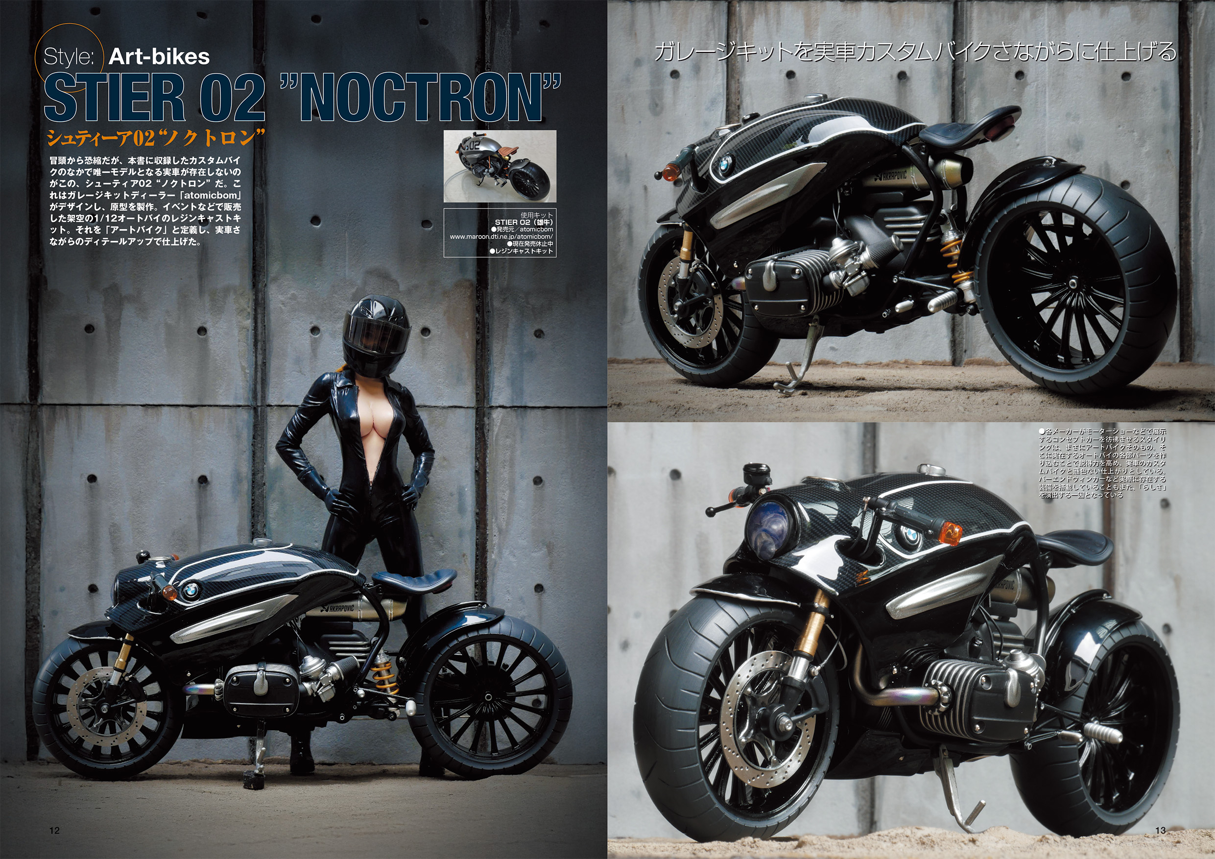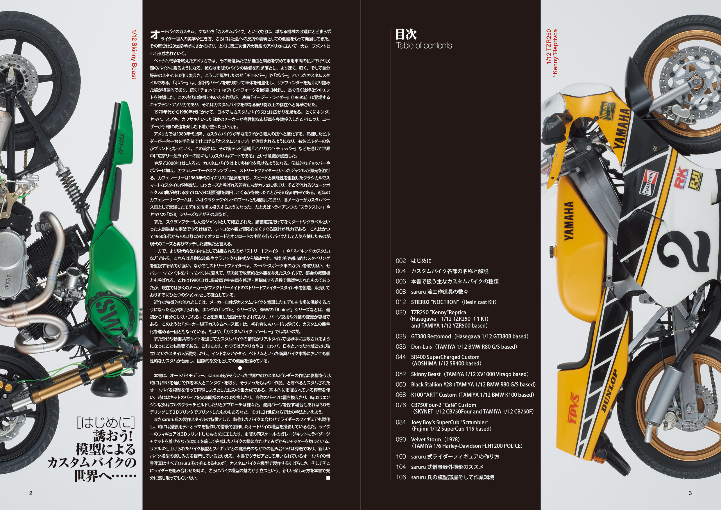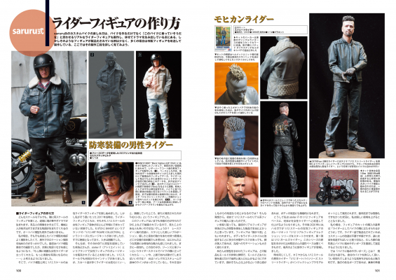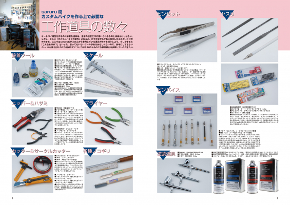本書ではそれらのバイク模型をフィギュアとともに収録しつつも、How toや製作風景など含め、多角的にsaruru氏の創作風景を収録しております。Saruru氏へのインタビューや、その製作工房の様子、実際のカスタムビルダーなどへのインタビューなどを交え、これまでにないバイク模型製作の楽しみ方を提案いたします。