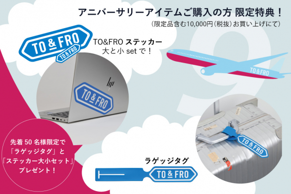 期間中、9周年アニバーサリーアイテムのご購入を含む税抜10,000円以上ご購入の先着50名様に、ノベルティとしてTO&FROステッカー大・小のセットに加え、「ラゲッジタグ」をプレゼントいたします。