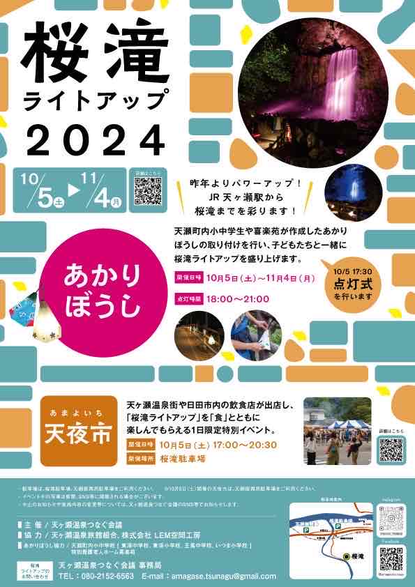 ■天夜市:天ヶ瀬温泉街や日田市内の飲食店が出店し、「桜滝ライトアップ」を「食」とともに楽しんでもらえる1日限定特別イベント