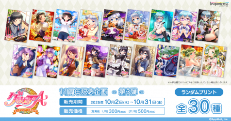 株式会社インクルーズ(東京都渋谷区、代表取締役社長 山﨑 健司)は、10月2日(木)より、日本全国のコンビニエンスストア店内のマルチコピー機を中心に、気軽にプリントできる「インクルーズプリント by eプリントサービス」にて「グリモアA ~私立グリモワール魔法学園~」11周年を記念したコンテンツプリントの第3弾がランダム式で販売開始したことをご報告させていただきます。