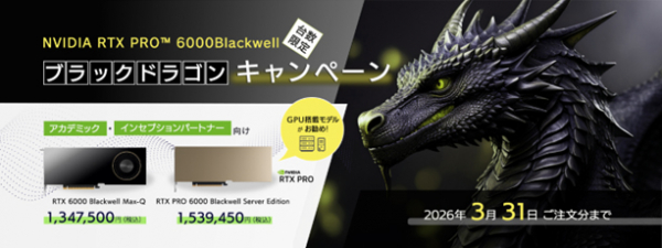 AIとビジュアライゼーションのソリューションカンパニーである株式会社ジーデップ・アドバンス(GDEP Advance,Inc. 本社:東京都中央区、代表取締役CEO:飯野匡道、東証スタンダード 証券コード:5885)は、2025年10月1日(水)よりアカデミック(学校教育法で定められた教育機関)ユーザーとNVIDIA Inception Programパートナー向けに、「RTX PRO 6000 Blackwell Max-Q Workstation Edition」および「RTX PRO 6000 Blackwell Server Edition」の2機種を対象とした「ブラックドラゴンキャンペーン」を台数限定で開催いたします。