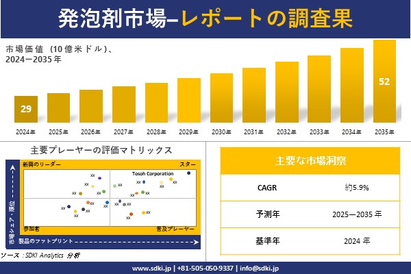 SDKI Analytics(本社:東京都渋谷区)は、このたび、2025年09月25に「発泡剤市場調査レポート:2025-2035年の市場規模、シェア、傾向の予測」を発表しました。発泡剤に関する市場調査レポートには、統計的及び分析的アプローチを使用した予測評価が含まれています。この調査レポートでは、一次及び二次調査方法を使用して分析された主要な業界洞察を通じて将来の傾向を理解できるようにすることで、主要な市場傾向を読者に説明しています。
