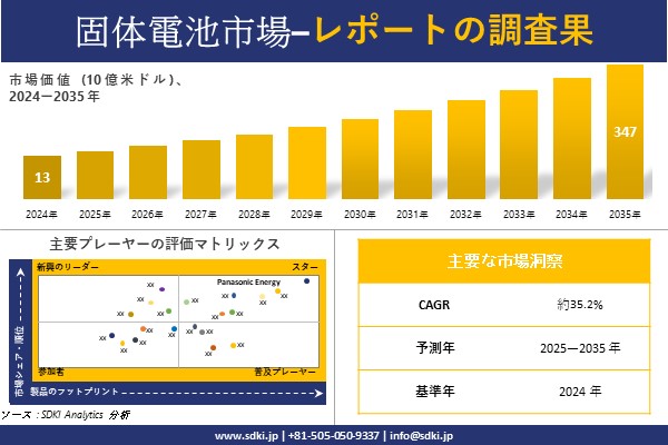 SDKI Analytics(本社:東京都渋谷区)は、このたび、2025年09月25に「固体電池市場調査レポート:2025-2035年の市場規模、シェア、傾向の予測」を発表しました。固体電池 に関する市場調査レポートには、統計的及び分析的アプローチを使用した予測評価が含まれています。この調査レポートでは、一次及び二次調査方法を使用して分析された主要な業界洞察を通じて将来の傾向を理解できるようにすることで、主要な市場傾向を読者に説明しています。