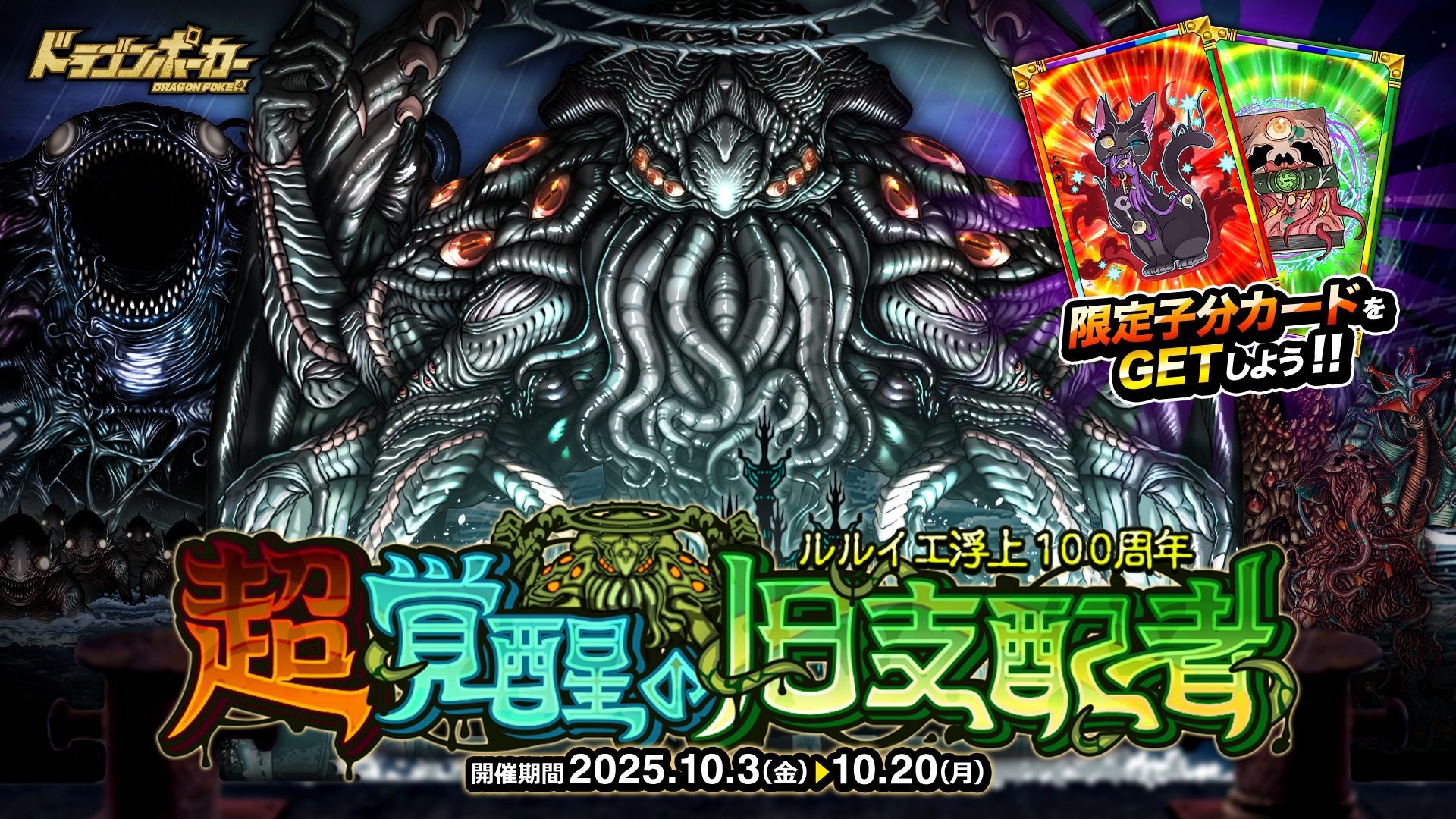 株式会社アソビズム(本社:東京都千代田区、代表取締役:大手智之)は、App Store・Google Playにて好評配信中のリアルタイム合体カードバトル『ドラゴンポーカー』で、2025年10月3日(金)よりルルイエ浮上100周年記念スペシャルダンジョン「超覚醒の旧支配者」を開催いたします。