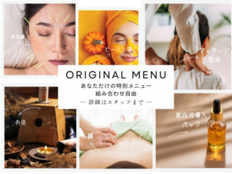 美容鍼やピーリング、エレクトロポレーションなどのフェイシャル施術から、整体・マッサージといったボディケアまで、その日の体調や肌の状態に合わせて自由に組み合わせられるオーダーメイド型コースです。