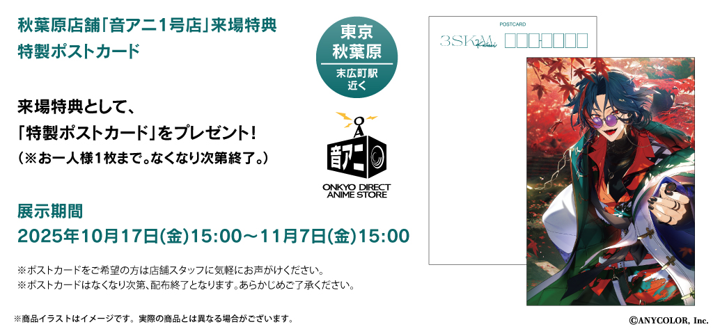 また10月17日(金)15:00~10月19日(日)20:00は混雑を想定し、ご入店整理券の配布をさせていただきます。なお整理券配布の情報、更新につきましては適宜「音アニ」公式X(@ONKYO_ANIME)にてお知らせいたします。