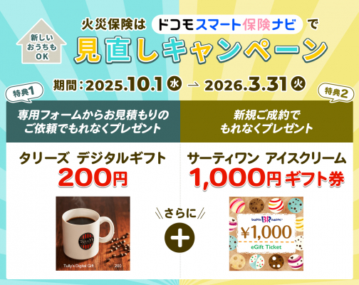 ・期間中、(株)ドコモ・インシュアランスを代理店として対象保険会社の火災保険を新規にご契約いただいた方にサーティワン アイスクリーム 1,000円ギフト券をもれなくプレゼントいたします。