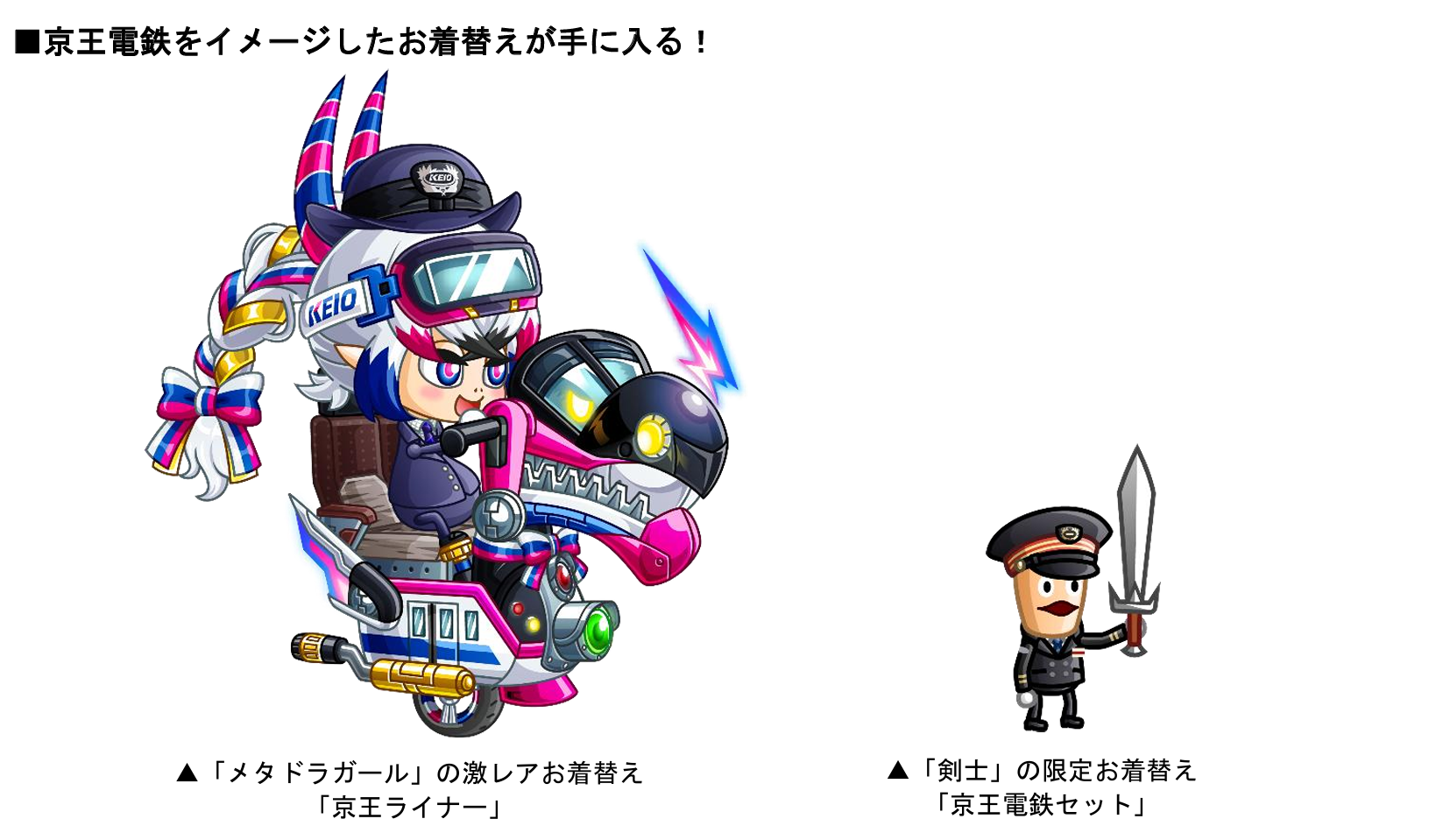 「京王電鉄のアバたま」に城ドラキャラのコラボ限定激レアお着替えとして、メタドラガールの「京王ライナー」が登場!さらに限定の剣士お着替え「京王電鉄セット」も登場いたします。アバたまを割って、コラボ期間中にしか手に入らない限定お着替えを手に入れましょう!