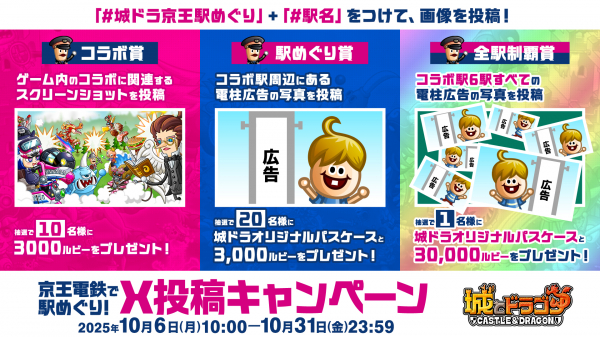 株式会社アソビズム(本社:東京都千代田区、代表取締役:大手智之)は、App Store・Google Playにて好評配信中の『城とドラゴン』で、2025年10月6日(月)10:00 ~ 10月31日(金)23:59の期間、城ドラオリジナルパスケースなどが当たる「京王電鉄で駅めぐり!X投稿キャンペーン」を開催することをお知らせいたします。