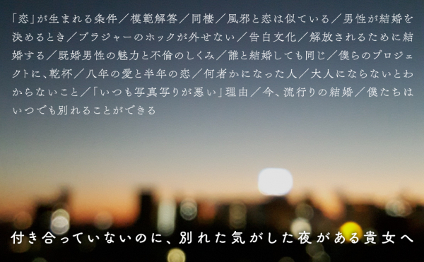 恋人、同棲、別れ、性格、セックス、不倫、嫉妬――