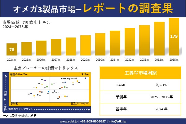 SDKI Analytics(本社:東京都渋谷区)は、このたび、2025年09月29に「オメガ3製品市場調査レポート:2025-2035年の市場規模、シェア、傾向の予測」を発表しました。オメガ3製品に関する市場調査レポートには、統計的及び分析的アプローチを使用した予測評価が含まれています。この調査レポートでは、一次及び二次調査方法を使用して分析された主要な業界洞察を通じて将来の傾向を理解できるようにすることで、主要な市場傾向を読者に説明しています。