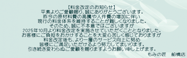 今回「もみの匠 船橋店」価格改定のお知らせ。