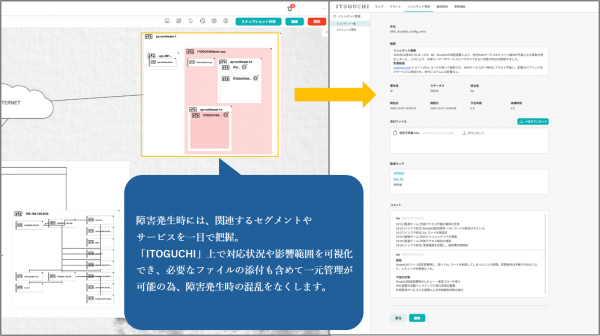 障害発生時「どこで何が起きているか分からない」という状況でも、「ITOGUCHI」では過去の対応履歴や、最新の構成図からトラブルシューティングが可能です。障害対応を属人化することなく、誰でも初動対応から原因調査まで迅速に実施することができます。