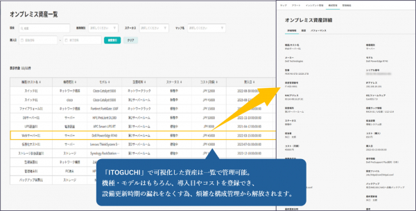 「ITOGUCHI」は、マルチクラウド・マルチベンダー環境に対応したインフラ構成管理ツールで、複雑化するITインフラの構成情報を自動で検知・描画し、常に最新の状態を維持することで、構成管理の効率化と障害対応の迅速化を実現します。