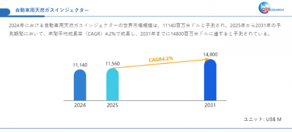 本調査では、2031年に世界の自動車用天然ガスインジェクター市場が約14800百万米ドルに達すると予測しています。この成長は、2025年から2031年にかけて年平均成長率(CAGR)4.2%で進むと見込まれており、2024年の市場規模は約11140百万米ドル、2025年には11560百万米ドルに達する見通しです。