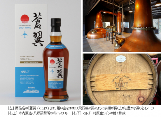 A-styleではANAオリジナル商品や旅をテーマにした商品を数多く取り扱い、「グルメ&ワイン」カテゴリーにおいてはANA機内ファーストクラスに採用されたワインや日本酒などを販売しています。同カテゴリーの新たなANAオリジナル商品として、国内外で人気が高まっているジャパニーズウイスキーに着目し、創業200年を超える茨城県の「木内酒造」と商品開発を行い、茨城で契約栽培した希少な国産大麦の麦芽のみを用いたANAオリジナルジャパニーズウイスキー『蒼翼』を今年1月に販売しました。限定300本が数日で完売し、反響が大きかったことを受け、この度、第二弾商品を販売します。市場で販売されていない原酒を熟成し、限定600本のウイスキーをご準備しました。