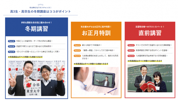 高校3年生と高卒生の「冬期講習」は、志望校別・テーマ別の多彩な講座を自由に組み合わせて受講、さらに、集中特訓できる「お正月特訓」、テストゼミ形式1日完結型の「直前講習」が展開されます。