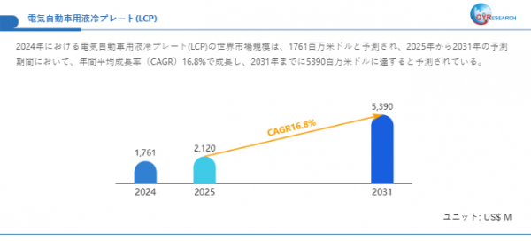 電気自動車用液冷プレート(LCP)の世界市場規模は、2024年に2120百万米ドルと推定され、2031年までに5390百万米ドルに達すると予測されています。2024年から2031年までの年平均成長率(CAGR)は16.8%%と見込まれています。