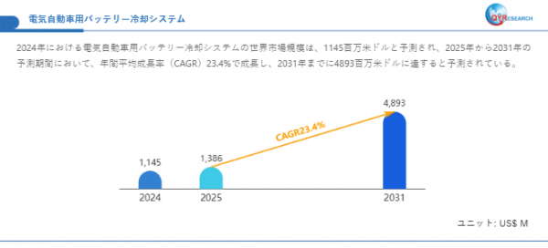 電気自動車用バッテリー冷却システムの世界市場規模は2024年に1145百万米ドルと推定され、2025年には1386百万米ドルに達すると予測されています。さらに、2025年から2031年まで年平均成長率(CAGR)23.4%で成長すると予測されています。この成長により、2031年には市場規模が4893百万米ドルに達すると見込まれています。