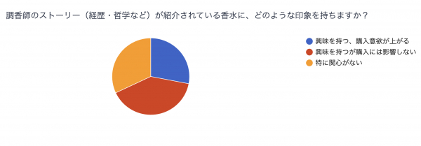 ・調香師という言葉自体を今回初めて知った。料理の価値が料理人ではなく味であるように、香水の価値は人ではなく香りだと思うので、調香師のストーリーがあっても特に購入意欲には影響しない。 料理人のようにメディアへの露出が多くほとんどの人が知ってる料理人の写真がある料理とかだったら購入意欲に影響するが、調香師でそういう人がいるとも聞いたことない。(50代/男性/群馬県/自営業、自由業)