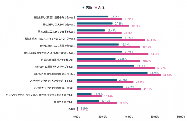 ※浮気と考える選択肢をそれぞれ選択した回答者の割合%を表示したグラフです。