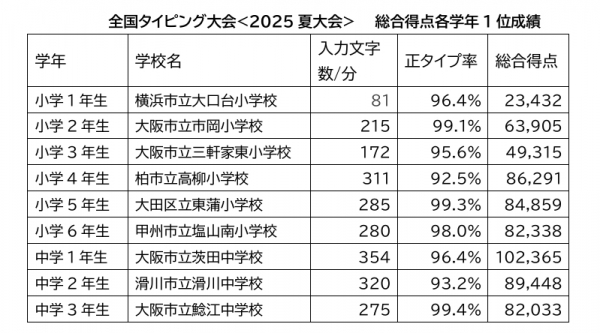 ※2025夏大会、各学年総合得点上位10名の結果は『らっこたん』利用者専用ページ「らっこたんひろば」と教育ネットHPにて公開中です。https://edu-net.co.jp/2508typing_results