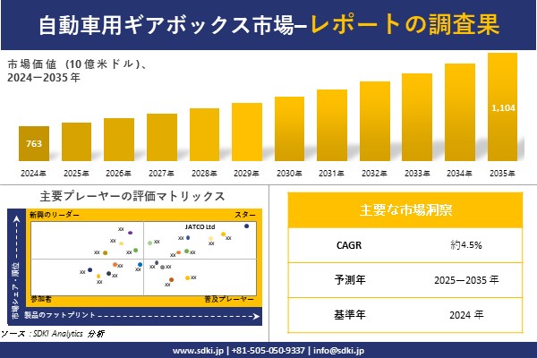 SDKI Analytics(本社:東京都渋谷区)は、このたび、2025年10月08に「自動車用ギアボックス市場調査レポート:2025-2035年の市場規模、シェア、傾向の予測」を発表しました。自動車用ギアボックスに関する市場調査レポートには、統計的および分析的アプローチを使用した予測評価が含まれています。この調査レポートでは、一次および二次調査方法を使用して分析された主要な業界洞察を通じて将来の傾向を理解できるようにすることで、主要な市場動向を読者に説明しています。