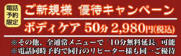 【飯田橋神楽坂店】 電話予約限定!ご新規様優待キャンペーン ボディケア50分2,980円!