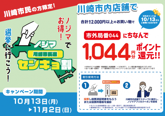 株式会社ノジマ(神奈川県横浜市、代表執行役社長・野島廣司、以下ノジマ)は、2025年10月26日(日)の川崎市長選挙の実施を受け、投票済証明書を提示することで特典が受けられる「センキョ割」(後援:センキョ割学生実施委員会)を実施することをお知らせいたします。