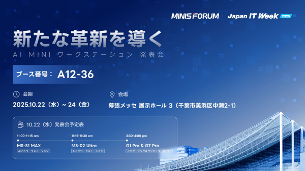会期初日の10月22日(水)11:00~11:30、MINISFORUMブースにて「次世代高性能AIミニワークステーション詳解」と題した特別デモンストレーションを実施いたします。製品の詳細な技術解説や最新情報を直接ご確認いただける貴重な機会です。
