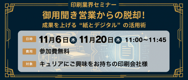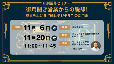 CEO:樋口 清政)は、2025年11月6日(木)/11月20日(木) AM11:00から、印刷業界向けに、御用聞き営業から脱却!成果を上げる“紙とデジタル”の活用術 と題して、セ