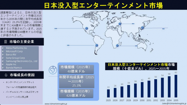 KDマーケット・インサイツは、「日本のイマーシブ・エンターテインメント市場の将来動向と機会分析 ― 2025年から2035年」をタイトルとする市場調査レポートを発表いたしました。本レポートの範囲には、現在の市場動向や将来の成長機会に関する情報が含まれており、読者がより適切なビジネス判断を下すための支援を目的としています。本調査レポートでは、KDマーケット・インサイツの研究者が一次・二次の分析手法を用いて、市場競争の評価、競合他社のベンチマーク、ならびに市場参入戦略(GTM)の理解を行いました。