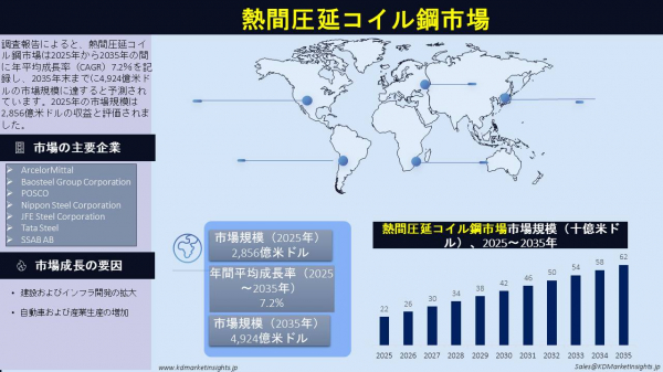 KDマーケット・インサイツは、「熱間圧延コイル鋼市場の将来動向と機会分析 ― 2025年から2035年」をタイトルとする市場調査レポートを発表いたしました。本レポートの範囲には、現在の市場動向および将来の成長機会に関する情報が含まれており、読者がより的確なビジネス判断を下すための支援を目的としています。本調査レポートでは、KDマーケット・インサイツの研究者が一次および二次の分析手法を用いて、市場競争の評価、競合他社のベンチマーク、ならびに市場参入戦略(GTM)の理解を行いました。