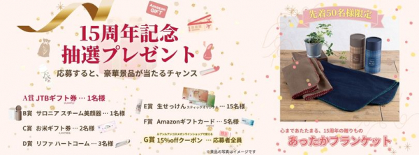 ギフト券、美顔器、お米券など、様々な景品をご用意しました。さらに、ご応募いただいたすべての方に15%OFFクーポンをプレゼントします。