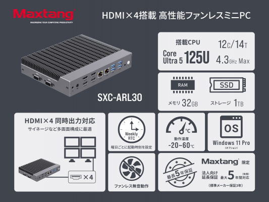 Maxtang SXC-ARL30は、高性能なCore(TM) Ultra 5 125Uを搭載したファンレスミニPCです。わずか35 mmの薄型筐体で、-20℃から60℃までの過酷な温度環境にも対応し、屋外や半屋外に設置するデジタルサイネージなどの機器への組み込みにも対応します。HDMIとUSB-C経由で最大4台の画面出力により大画面マルチディスプレイ環境に幅広く対応します。Linux環境向けにOSレスのモデルをラインアップし、オプションとしてWindows 11 Proプリインストールが可能なほか、Weekly RTC(リアルタイムクロック)機能で曜日別に起動時間を設定することができるため、平日・土日など稼働時間が異なる施設での運用にも適しています。