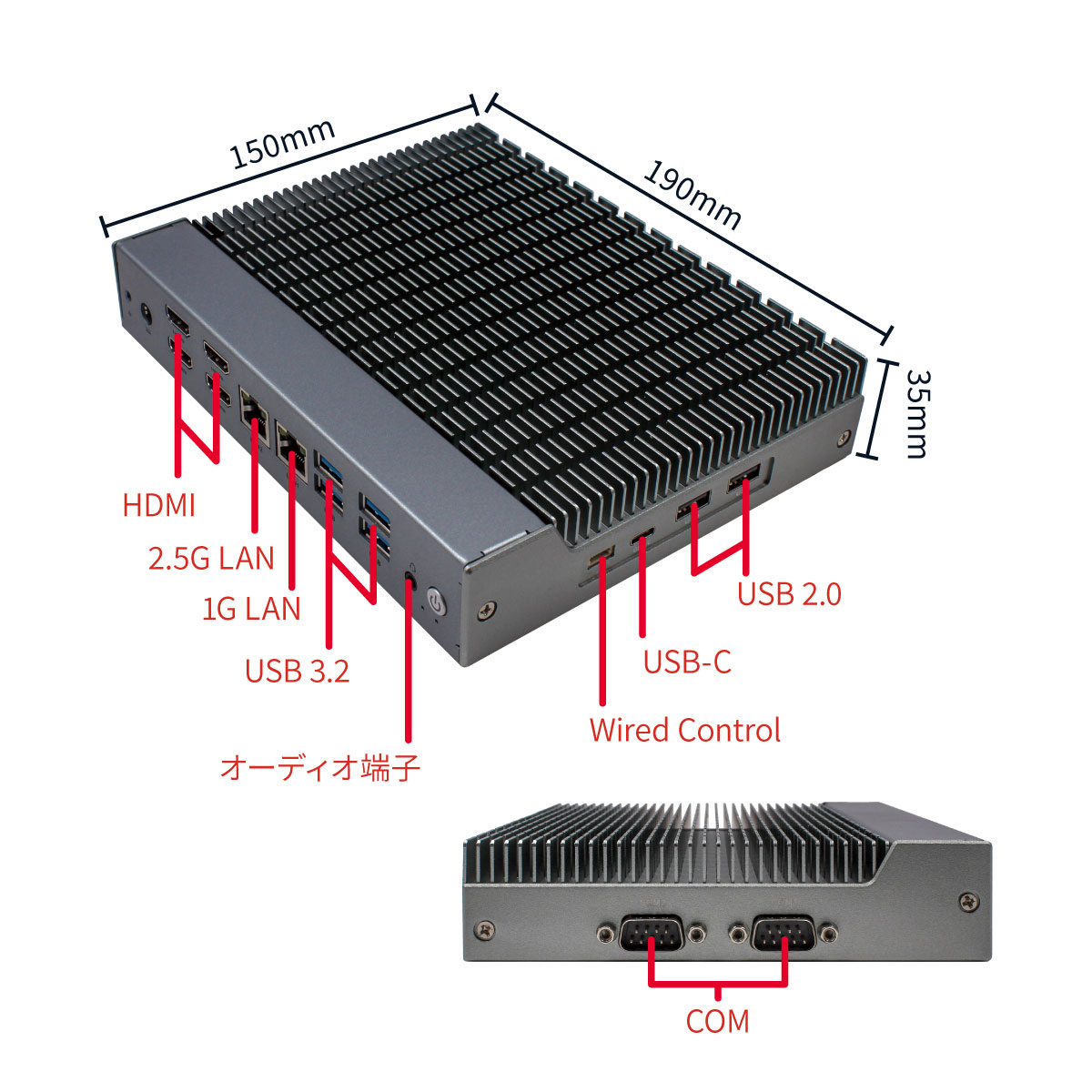 有線接続のLANポート2基に加えてUSB 3.2ポート4基やUSB-Cポートを搭載し、さらにCOMポート(RS232)も標準搭載しています。